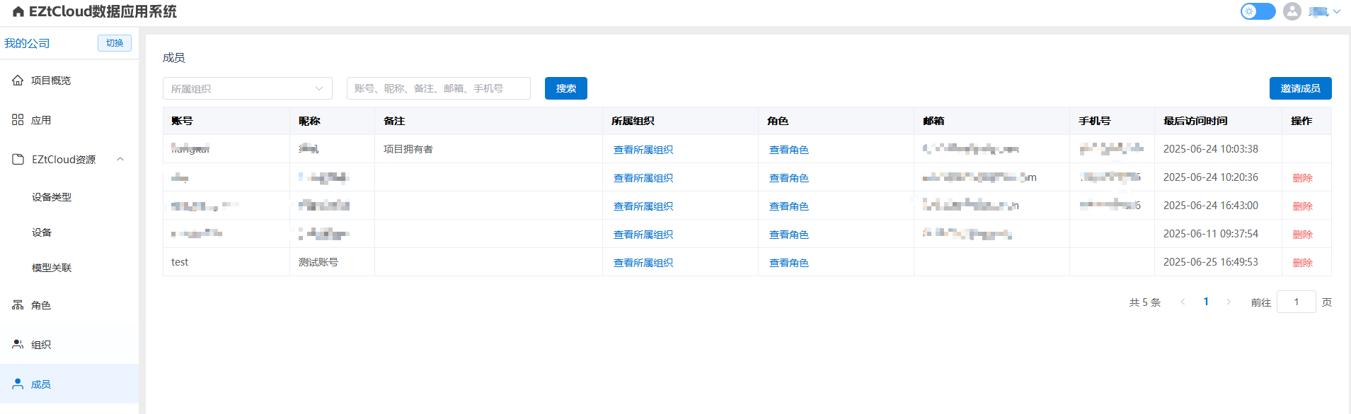 每个成员具有账号、昵称、所属组织(可多个)、绑定角色(可多个角色)、绑定的邮箱、绑定的手机号登信息,一个项目有一个项目拥有者,项目拥有者点击“邀请成员”来邀请其他用户进入该项目