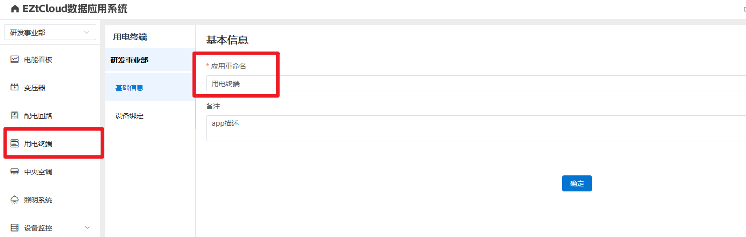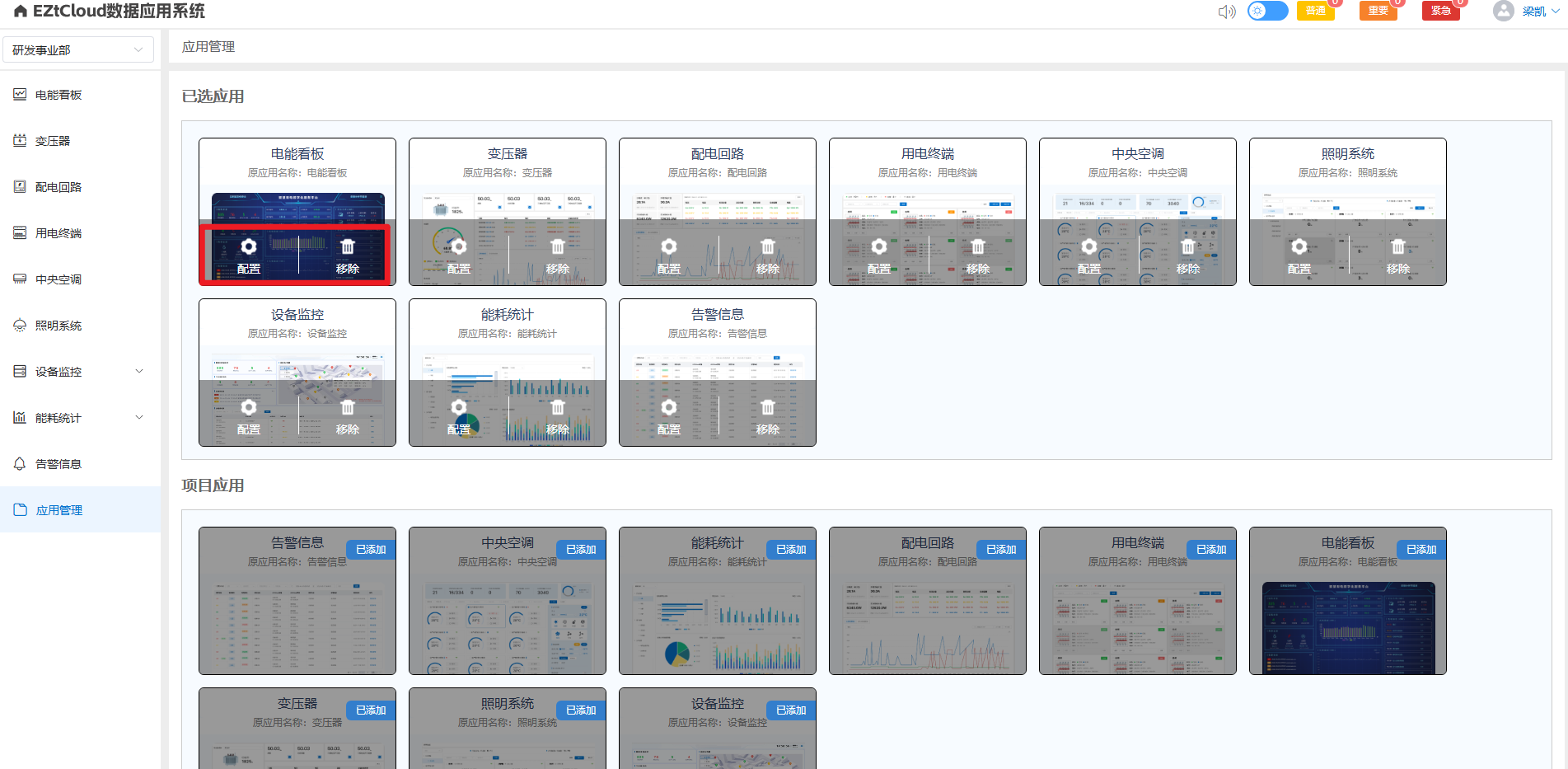 每个组织都有“应用管理”菜单(当有权限时),可以将该项目应用添加到组织应用,每个组织应用具有“配置”和“移除”按钮,一般应用配置包括应用重命名,给应用添加设备、设备分组等功能,不同的应用配置可能不同,当不需要该应用时,可以点击“移除”将该应用删除,应用移除后再添加,该应用的配置保持不变。