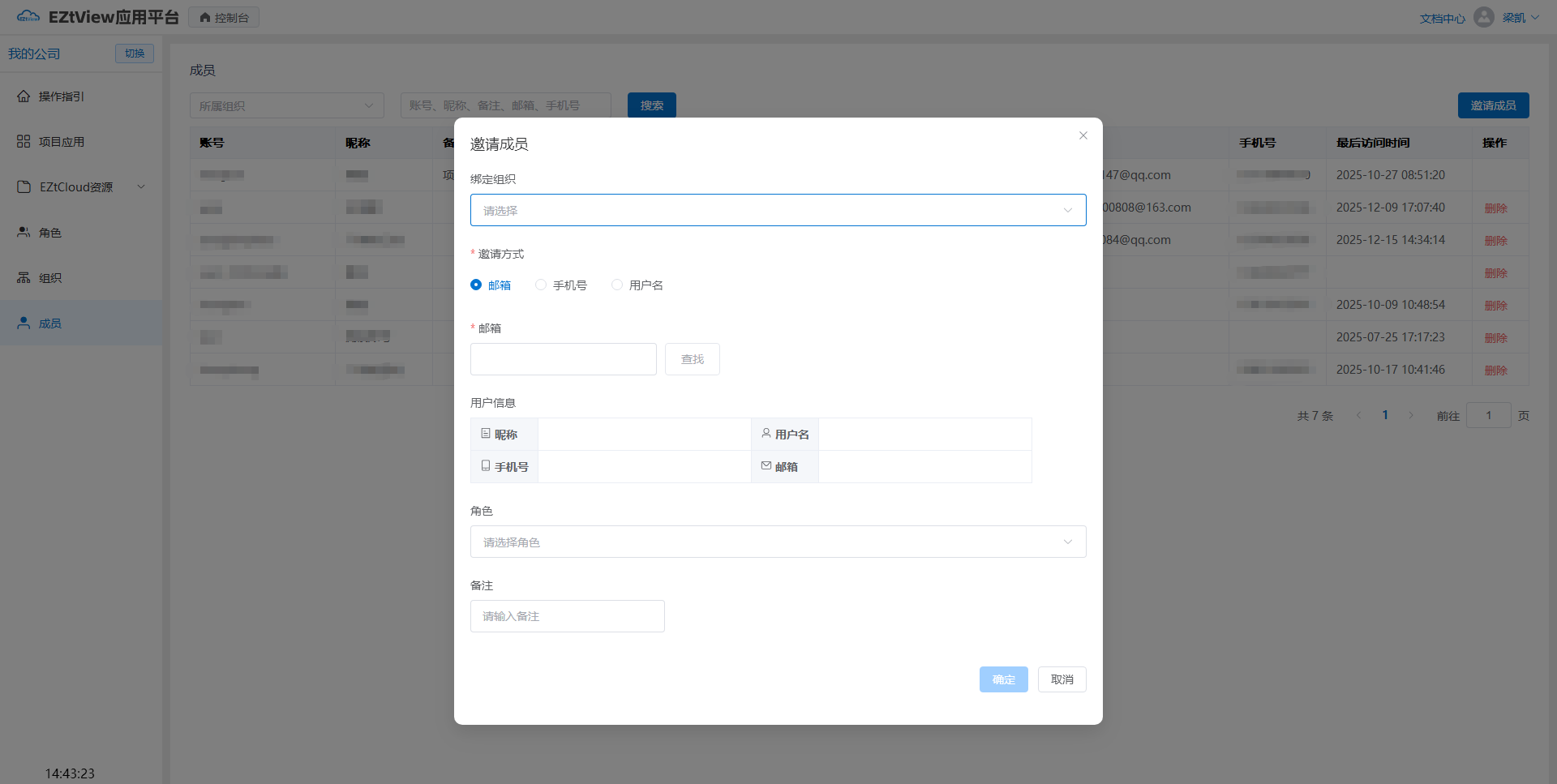 点击“邀请成员”弹出邀请成员窗,只有项目拥有者才能邀请成员,邀请成员时要绑定组织、选择邀请方式和选择角色。
