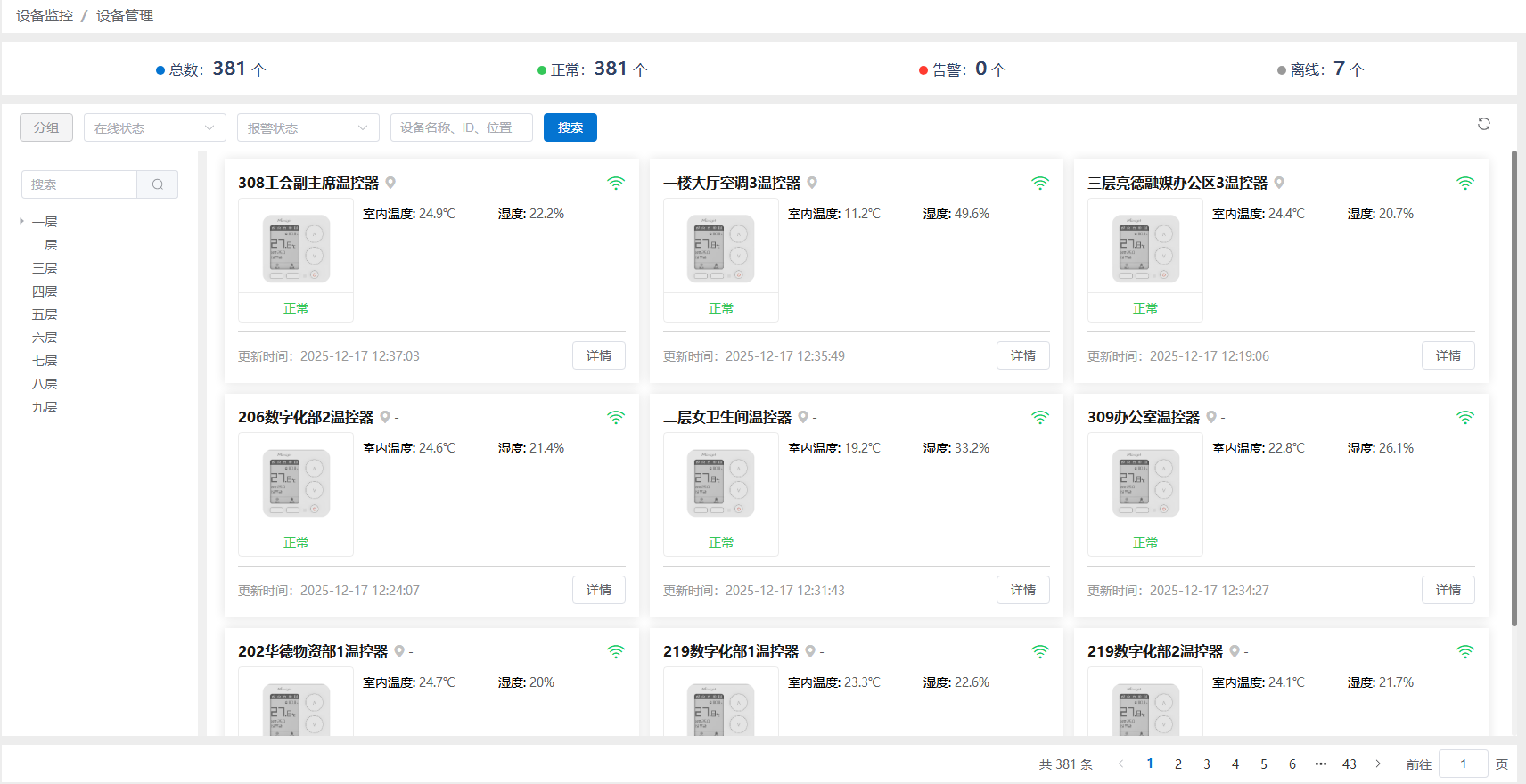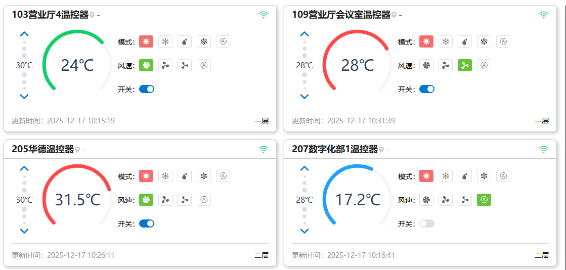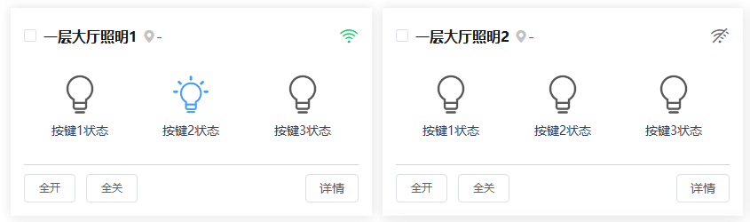- 设备在线离线:卡片中"WiFi"图标绿色在线,灰色离线