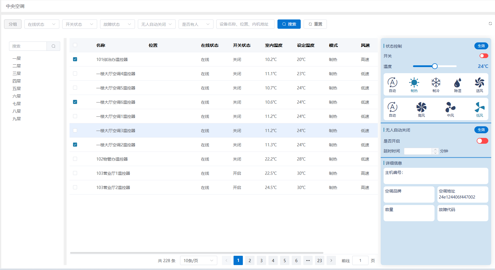 中央空调应用用于监控智能空调控制设备,如智能温控器、空调网关等。中央空调应用具备的功能如下: