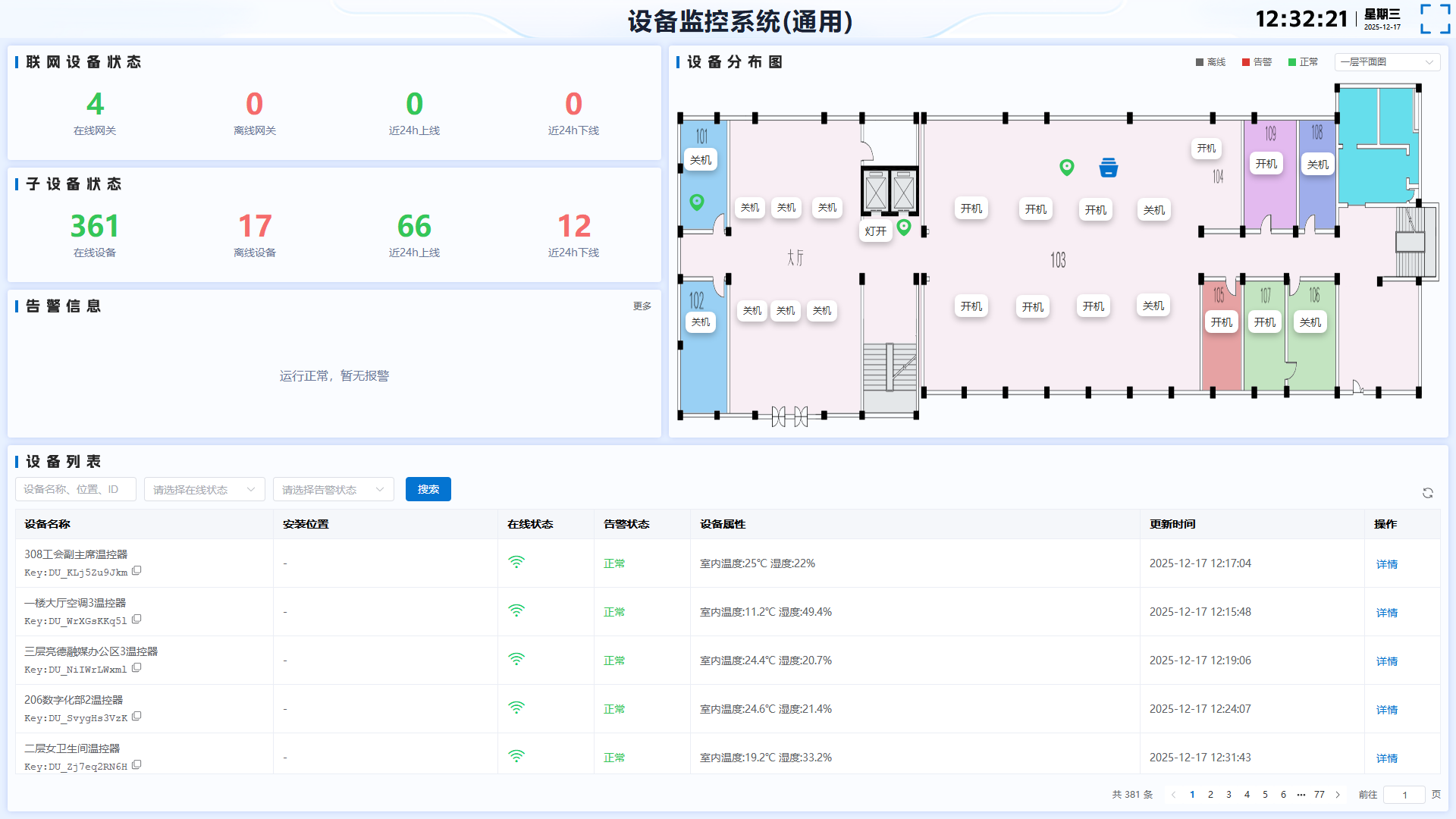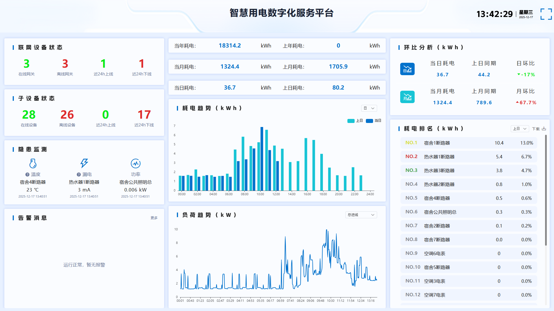 - 设备统计:设备总数、正常设备数量、告警设备数量、离线设备数量和超功率设备数量