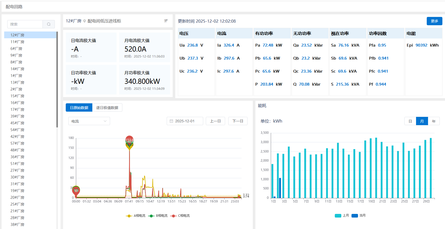 主要用于监测配电柜塑壳断路器回路,查看极值数据、实时数据、能耗、历史数据曲线等