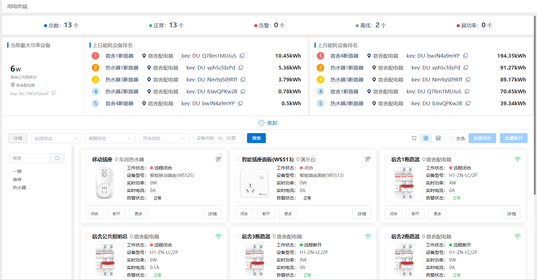 主要用于监测智能空开、智能插座等设备,实现状态监测、批量控制、功率限制、实时和历史数据查看、告警信息查看、能耗排名等