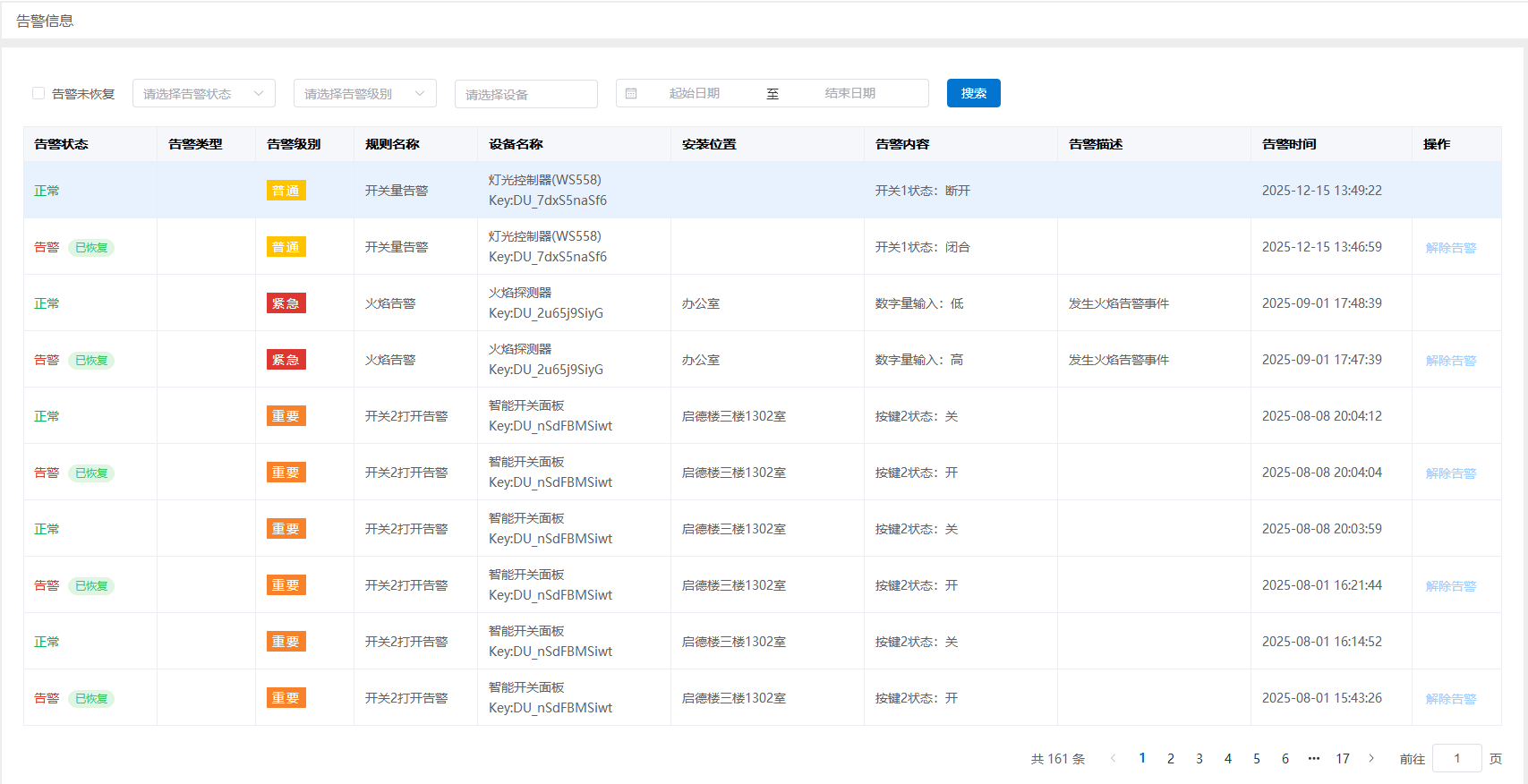 - 设备筛选:按照分组筛选、在线状态筛选、报警状态筛选、开合状态筛选、模糊筛选