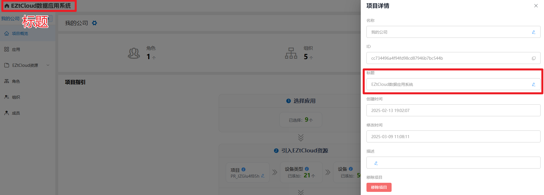 可以设置项目信息、显示角色数量、组织数量、成员数量、项目配置指引。