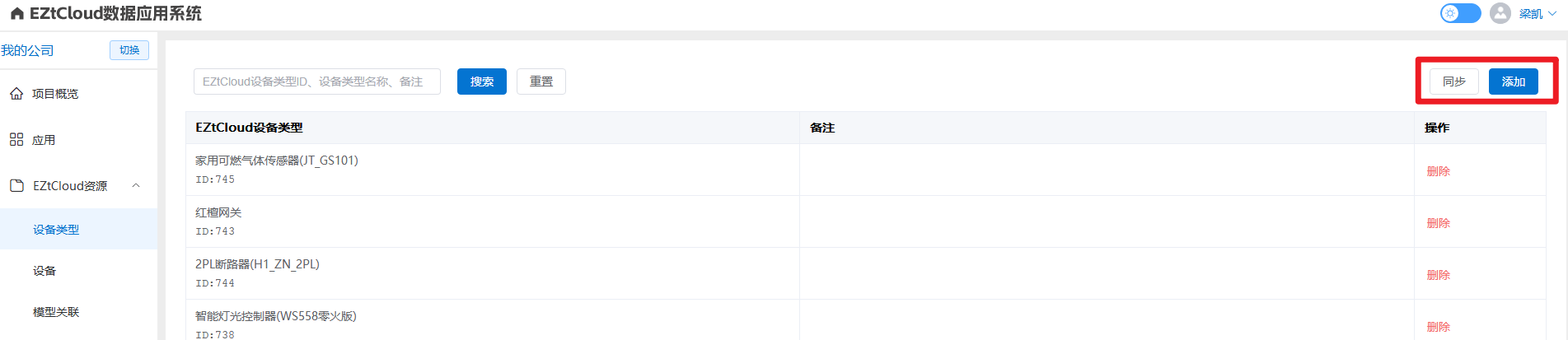 设备类型页有“添加”和“同步”两个按钮。添加按钮,是将EZtCloud设备类型添加到本系统,当EZtCloud设备类型信息改变,点击“同步”按钮,比如修改了设备类型名称。